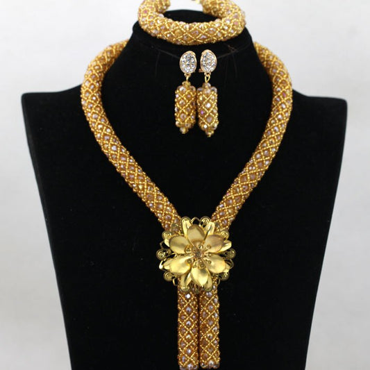 Nigerian African Party Jewelry Set Shinny White and Gold Crystal Rope Chain Necklace Set Women Birthday Gift Jewelry Set ABH467